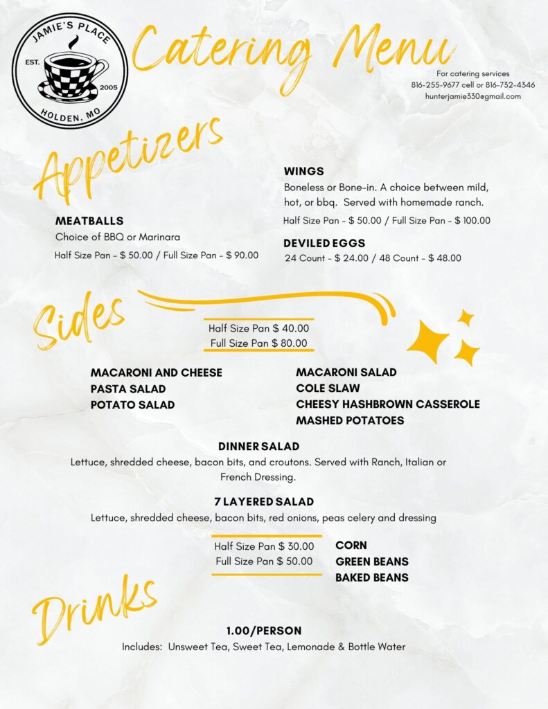 Jamie's Place Catering Our Catering Menu Prices are subject to change. Please contact us for your event at: 300 S. Market Holden, MO 64040 816-732-4346 Download Catering Menu